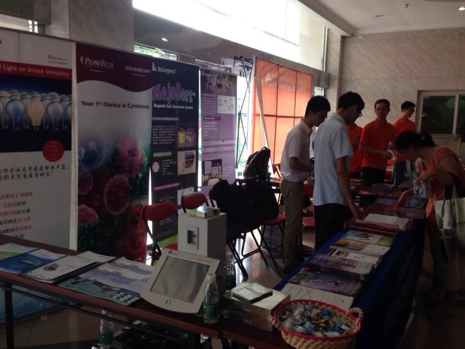 我司在A1號展臺,準(zhǔn)備了5副免疫殺撲克牌供展覽用,同時帶來公司的產(chǎn)品目錄冊以及免疫組(小彩圖:mechanisms of cell death,DC、巨噬細(xì)胞,中彩圖:Breg,Treg,th17)等資料以及細(xì)胞組的轉(zhuǎn)染、細(xì)胞治療組的PPT和儀器彩頁等資料供參會人員瀏覽,展臺的兩邊我們放置了多因子、磁珠分選等3個易拉寶供參會人員觀看,技術(shù)部同事現(xiàn)場進(jìn)行技術(shù)儀機器演示。