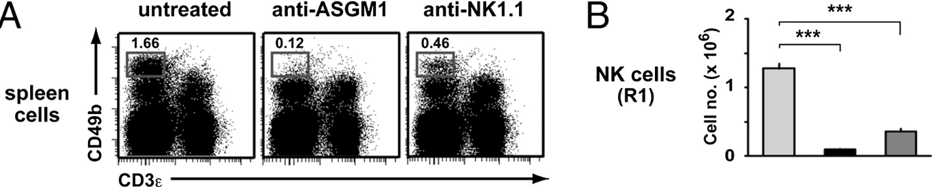 文獻來源:Nishikado H, et al. 2011. J. Immunol. 186:5766. 該圖顯示C57BL/6小鼠分別腹腔注射anti-ASGM1(10ul)或anti-NK1.1(300ug)一天之后,分離脾臟細胞染色,NK細胞(CD49bhighCD3ε?)的染色結果。