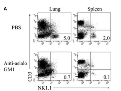 文獻來源:Zhou G, et al. 2013. Eur. J. Immunol. 43:929. 該圖顯示尾靜肪注射anti-asialo GM1PBS,每五天一次,不管是肺還是脾臟,都顯示出NK細胞消耗率。