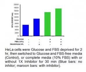 BioVision EZCellTM Glucose Uptake Assay kit 一種簡單超級靈敏、易用葡萄糖攝取檢測試劑盒。試劑盒利用一種特殊的己糖激酶抑制劑抑制己糖激酶,己糖激酶是糖代謝過程中涉及到的第一個葡萄糖被細胞攝取后,可捕獲葡萄糖。 葡萄糖攝取利用一系列酶反應檢測的,被氧化的葡萄糖產生的中間產物可以與OxiRed?探針反應而發出熒光信號(Ex/Em=535/587 nm 。熒光信號量直接反應細胞所攝取積累的葡萄糖。不像其他試劑盒是直接檢測葡萄糖衍生物BioVision 提供了一種直接而強大的葡萄糖研究工具,可用于篩選表征葡萄糖攝取相關疾病的藥物。