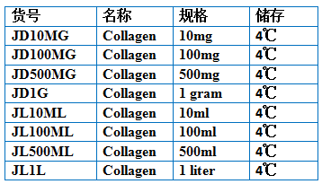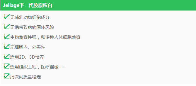 膠原蛋白是一種組成細胞外基質(ECM)關鍵的蛋白質,膠原蛋白由三條高度保守的α-螺旋多肽鏈組成。英國Jellagen提供的下一代Collagen(膠原蛋白)源于水母,兼有Type I和Type II膠原蛋白的活性。良好的膠原蛋白強度和彈性,使其適用于2D和3D細胞培養、組織工程以及醫療儀器。Jellagen生產的膠原蛋白由于其低免疫源性低病原污染性,有著良好的組織兼容性,在創傷修復和組織工程學領域有很好的應用前景