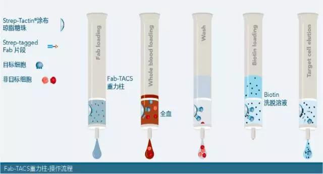 Fab-TACS重力柱內(nèi)裝有經(jīng)Strep-Tactin?涂布的細(xì)胞級(jí)中型瓊脂糖珠(cell-grade agarose matrix),如此一來,含有Twin-Strep-tag?的Fab片段(Fab-Streps)能與瓊脂糖珠結(jié)合。將全血或血液樣本加入重力柱,此時(shí)目標(biāo)細(xì)胞會(huì)與Fab-Streps進(jìn)行特異性結(jié)合,非目標(biāo)細(xì)胞則會(huì)直接流出。隨后,清洗重力柱將多余的非目標(biāo)細(xì)胞或血液雜質(zhì)洗去。最后,加入生物素(biotin)中斷Fab-Streps與Strep-Tactin?間的結(jié)合,與此同時(shí),低親和力的Fab-Streps也會(huì)從目標(biāo)細(xì)胞上解離,而您便能獲得不含標(biāo)記、幾近原始的目標(biāo)細(xì)胞來進(jìn)行后續(xù)的實(shí)驗(yàn)。