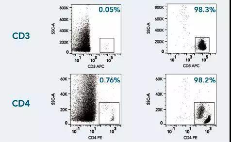 使用Fab-TACS細(xì)胞分選重力柱分離全血中的CD3+及CD4+免疫細(xì)胞。細(xì)胞樣本以CD3-APC (OKT-3)或 CD4-PE (OKT-4) 抗體染色后,進(jìn)行流式分析,左右分別為分選前后的細(xì)胞群分布。死細(xì)胞以DAPI染色先行排除,并使用不同F(xiàn)SC/SSC信號(hào)來排除雙粘體和細(xì)胞碎片。結(jié)果顯示:即使直接處理全血,F(xiàn)ab-TACS科技仍能分離出高純度目標(biāo)細(xì)胞。