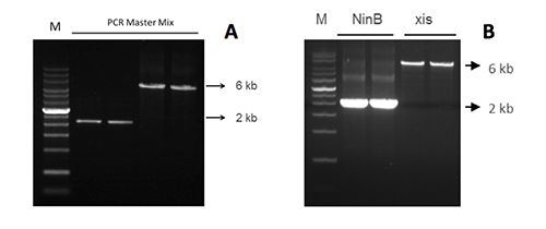 B 使用PCR Dye Mix II擴(kuò)增NinB基因(2 kb)和xis基因(6 kb)