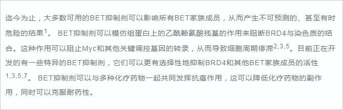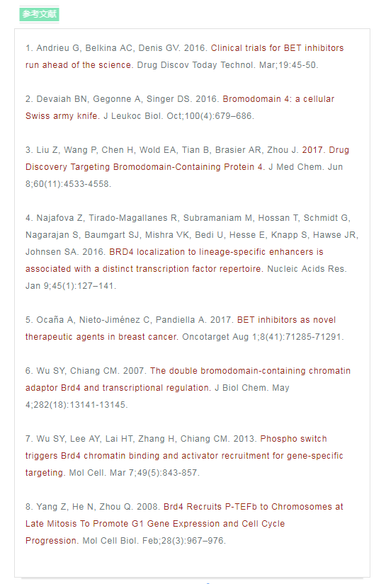 BRD4(溴結(jié)構(gòu)域蛋白4)是一種轉(zhuǎn)錄調(diào)節(jié)因子。研究發(fā)現(xiàn),BRD4在癌癥、自身免疫和炎癥性疾病中具有重要的作用1,2。 正常生理情況下,BRD4主要參與細(xì)胞周期過(guò)程中的基因表達(dá)調(diào)控,其可以與乙酰化染色質(zhì)結(jié)合,保持各種基因在細(xì)胞分裂循環(huán)過(guò)程中的穩(wěn)定表達(dá) ,這種現(xiàn)象被稱(chēng)為表觀遺傳記憶或基因轉(zhuǎn)錄的“書(shū)簽”2,7。 同時(shí),BRD4在調(diào)控分化和發(fā)育中也起著關(guān)鍵作用2,4。 如果BRD4缺失,骨髓干細(xì)胞將不能分化成為B和T細(xì)胞2。 BRD4亦是MEFs或B細(xì)胞重編程為誘導(dǎo)多能干細(xì)胞過(guò)程中重新表達(dá)干細(xì)胞基因所必需的,在成骨細(xì)胞分化過(guò)程中BRD4也發(fā)揮重要作用。 綜上,BRD4在細(xì)胞周期調(diào)控和分化中的重要作用使其成為癌癥和免疫系統(tǒng)疾病的新興治療靶點(diǎn)。