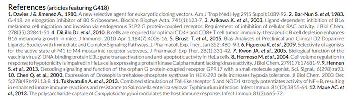 遺傳霉素(Geneticin, G418)是一種氨基糖甙抗生素,是穩(wěn)定轉(zhuǎn)染常用的篩選抗生素之一。哺乳動物細(xì)胞的篩選濃度根據(jù)細(xì)胞類型等多種因素而變化,以InvivoGen的G418為例(不同廠家不同批次產(chǎn)品溶解度各有差異,僅供參考)。在開始實驗前,建議通過測試幾種濃度(100 μg/ ml至1 mg / ml)來確定殺死宿主細(xì)胞系所需的最佳抗生素濃度。