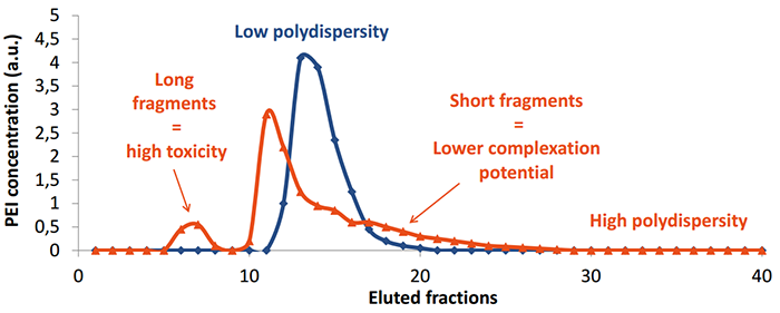 由于長片段的PEI對細胞有毒性,而短片段PEI結合DNA能力較差(見紅色),所以優化PEI的片段大小,降低其分散性能減少細胞毒性,同時增加結合DNA的能力(見藍色)和轉染重復性。