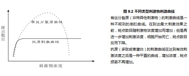 其一、非特異性的刺激物刺激效果不穩(wěn)定。如圖9.2所示,非特異性的刺激物(有絲分裂原Mitogen)的刺激曲線幾乎沒有平坦的部分。也就是說,刺激物的濃度有細(xì)微變化,馬上就會體現(xiàn)在刺激斑點數(shù)目的變化上了,這樣實驗結(jié)果很難完全重現(xiàn)。相反,抗原的刺激曲線非常平坦,只要達(dá)到有效刺激濃度,斑點頻率就不再變化。