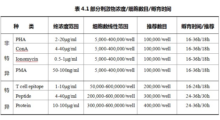 不論是普通多肽(比如重疊多肽庫(kù))還是蛋白質(zhì)或者蛋白類的組織提取物,這些刺激物都需要APC的攝取、內(nèi)化、加工、呈遞,之后T細(xì)胞才能被刺激。所以,使用這些刺激物的時(shí)候,一定要保證足夠的細(xì)胞密度。根據(jù)我們的經(jīng)驗(yàn),細(xì)胞密度要至少達(dá)到20萬(wàn)-30萬(wàn)每孔。多肽推薦的細(xì)胞密度為30萬(wàn)/孔,蛋白推薦的細(xì)胞密度為40萬(wàn)/孔。也可以根據(jù)實(shí)際情況,在線性范圍內(nèi)調(diào)整,參見表4.1與圖4.2。