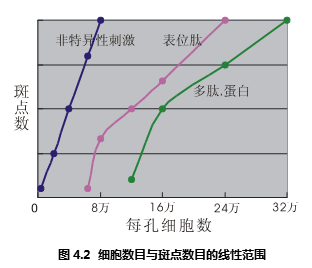 非特異性的刺激物可以直接刺激淋巴細(xì)胞,這種刺激不依賴于APC或者其它輔助細(xì)胞,是單細(xì)胞反應(yīng)行為。所以它對(duì)細(xì)胞密度沒(méi)有要求,在極寬的細(xì)胞濃度范圍之內(nèi)——多至40萬(wàn)/孔,低至5千/孔——斑點(diǎn)數(shù)量和細(xì)胞數(shù)量都有簡(jiǎn)單的正比例關(guān)系,參見圖4.2。但是考慮到,只有恰當(dāng)?shù)陌唿c(diǎn)數(shù)目才便于數(shù)據(jù)統(tǒng)計(jì),所以推薦細(xì)胞密度為10萬(wàn)/孔。如果細(xì)胞數(shù)目過(guò)多,滿孔都會(huì)被斑點(diǎn)覆蓋,并且相互重疊。