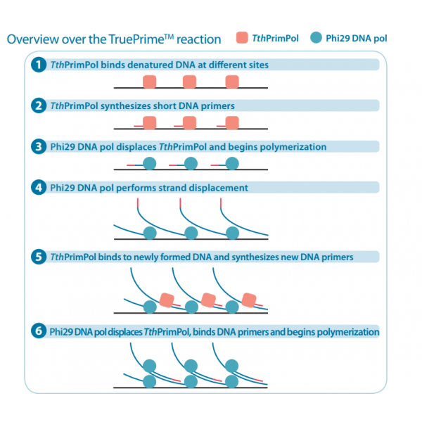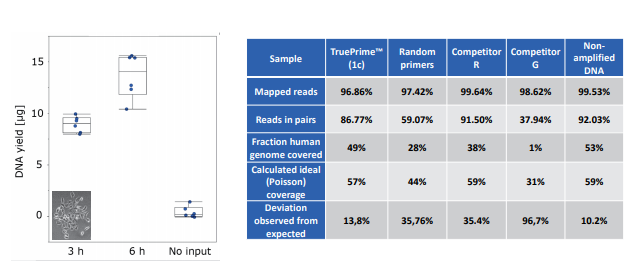 TruePrime?采用MDA技術(shù),基于新型的TthPrimPol 引物酶和Phi29 DNA聚合酶,擴(kuò)增過程無需添加隨機(jī)引物,減少了擴(kuò)增偏倚,提高了擴(kuò)增過程的覆蓋率和保真性,并且對于污染的外源DNA不敏感,可重復(fù)性好。TruePrime?可用于單個(gè)細(xì)胞或少量細(xì)胞的全基因組擴(kuò)增,與常見的NGS平臺如Illumina和IonTorrent等兼容性良好。