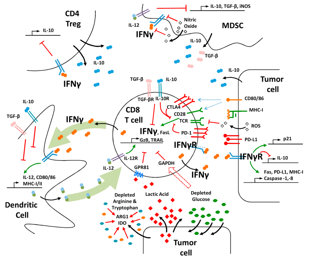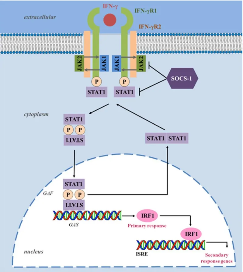 IFN-γ信號通路協(xié)調(diào)多種生物反應,在先天和適應性免疫中扮演的重要角色。IFN-γ可以通過促進Th1細胞、CD8+T淋巴細胞、NK細胞、樹突狀細胞及巨噬細胞的活性,抑制Treg、Th2和Th17細胞分化和功能,發(fā)揮免疫調(diào)節(jié)作用。此外,IFN-γ可激活巨噬細胞,使其分化為M1型巨噬細胞。