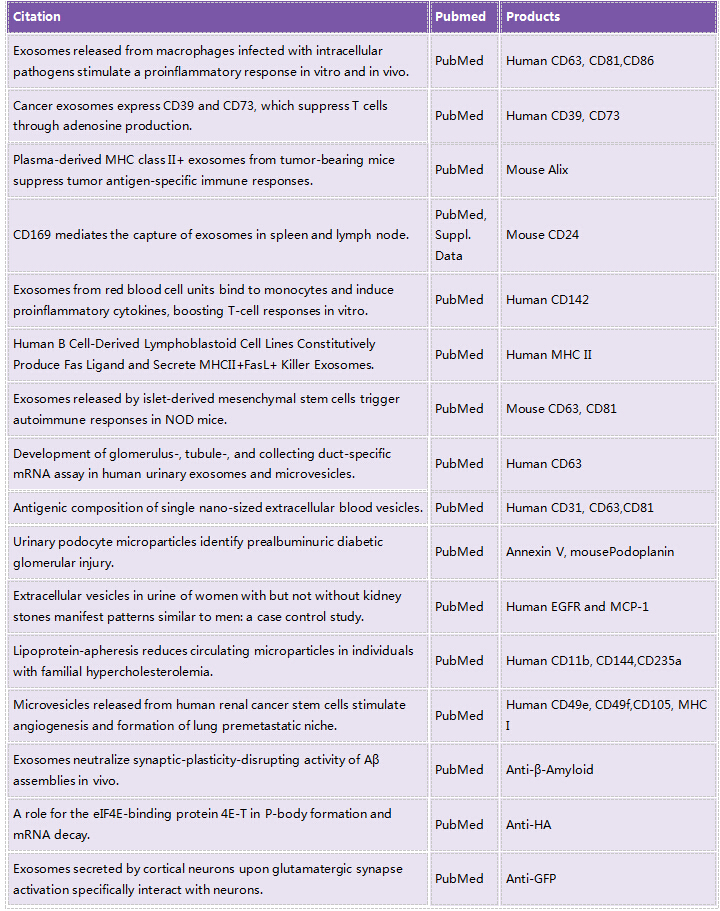 BioLegend公司提供抗人,小鼠和大鼠等完整的抗體列表,針對多種靶蛋白(包括表面和細胞內),通過試驗應用如流式細胞術,免疫印跡,免疫熒光和免疫組化等方法來確定外泌體的特征。瀏覽http://www.biolegend. com/cell_ markers找到免疫細胞特異性標記繼而可以確定外泌體來源于何種細胞。